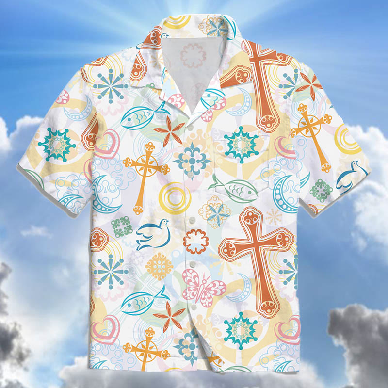 Cross Fish Dove Christian Printed Hawaiian Cuban Collar Shirt