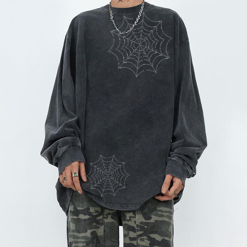 Spider Web Printed Acid Washed Long Sleeves T-shirt
