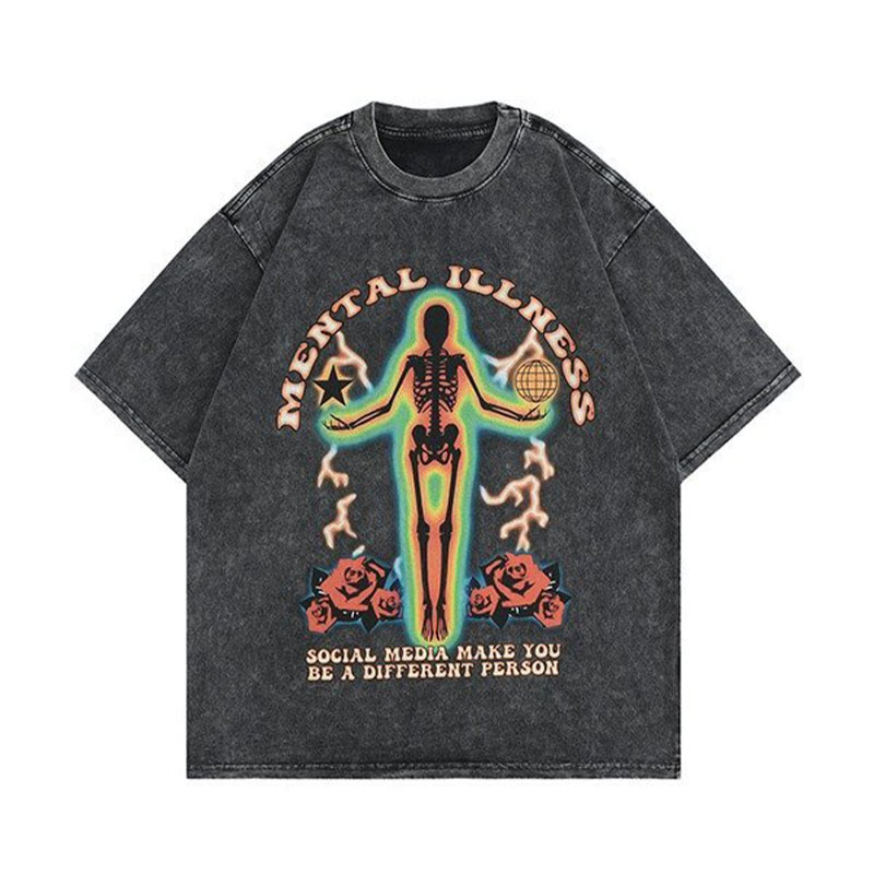 Men's Vintage Mental Illness Skull Graphic Print Acid Washed T-shirt