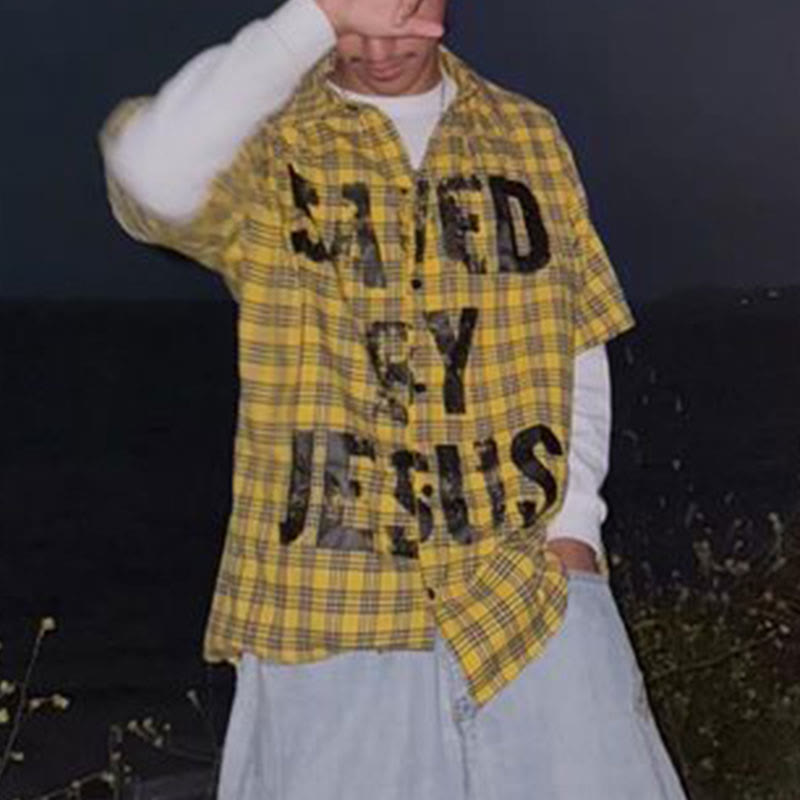 Men's Saved By Jesus Yellow Plaid Print Short Sleeve Shirt