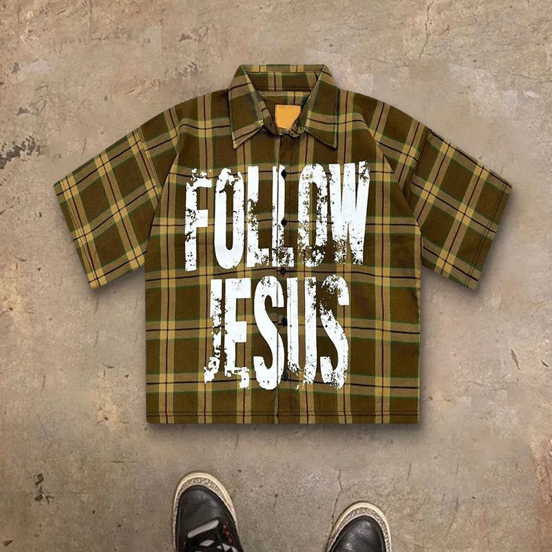 Men's Follow Jesus Classic Yellow Plaid Print Short Sleeve Shirt