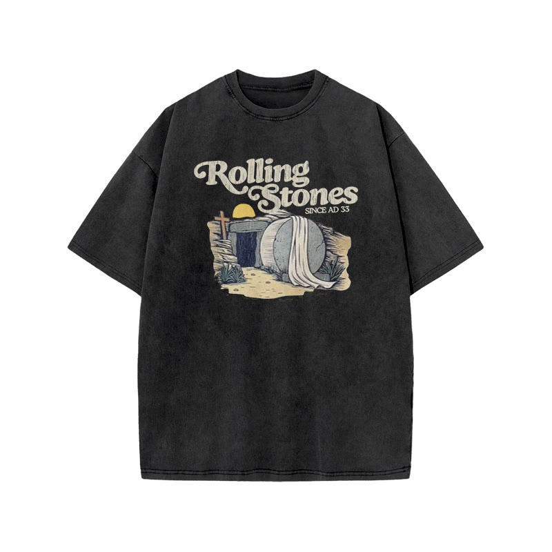 Unisex Rolling Stones Cross Print Acid Washed T-shirt