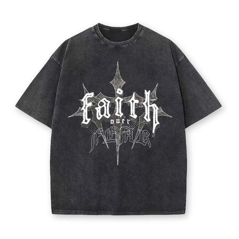 Vintage Heavyweight Streetwear Faith Over Fear Dark Cross Printed Acid Washed T-shirt