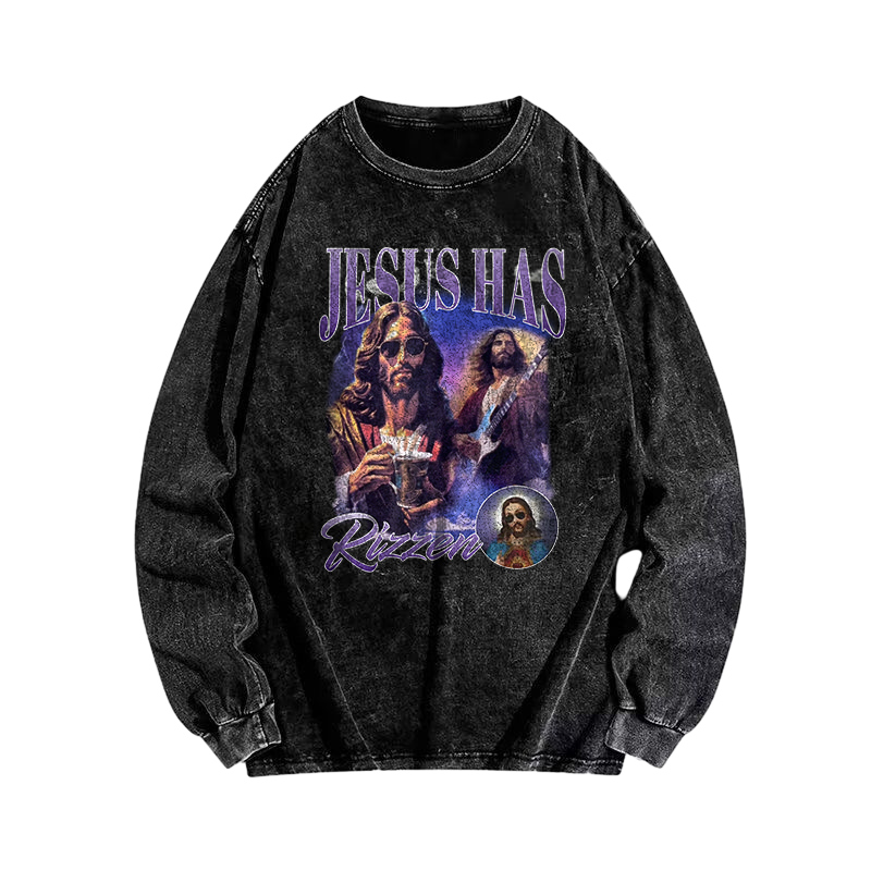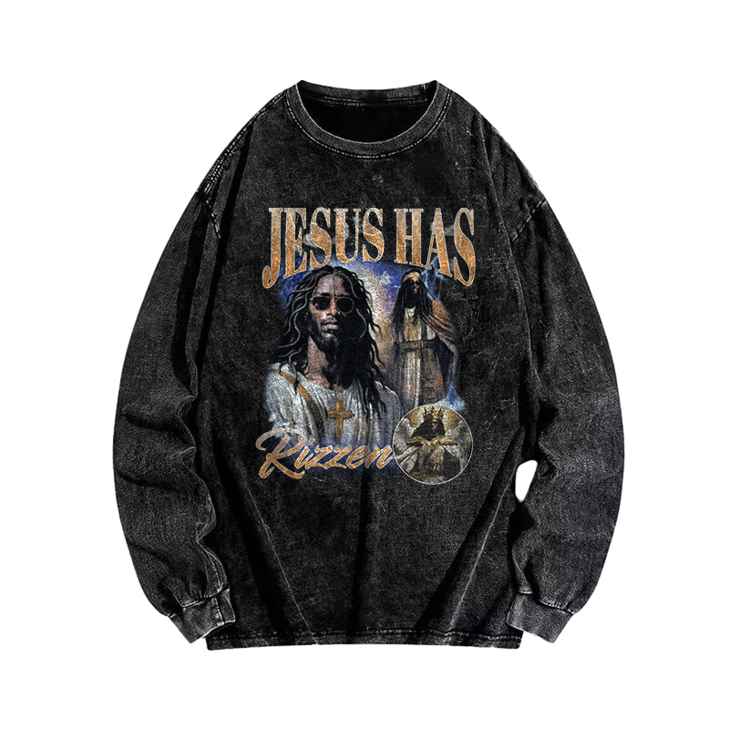Jesus Has Rizzen Funny Printed Washed Long Sleeve T-shirt