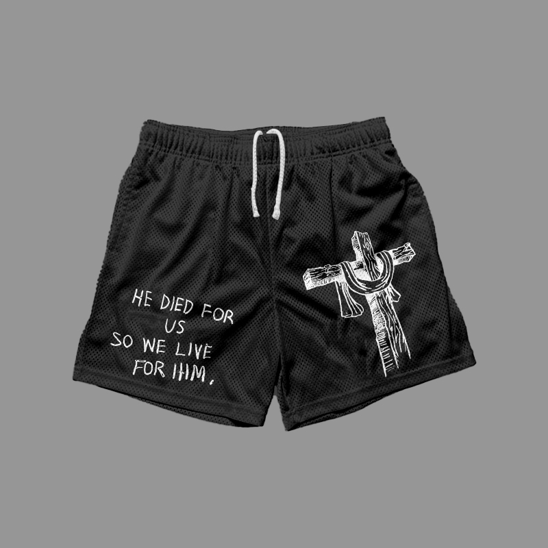 He Died For Us So We Live For Him Print Mesh Shorts
