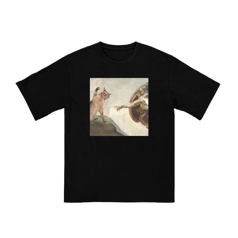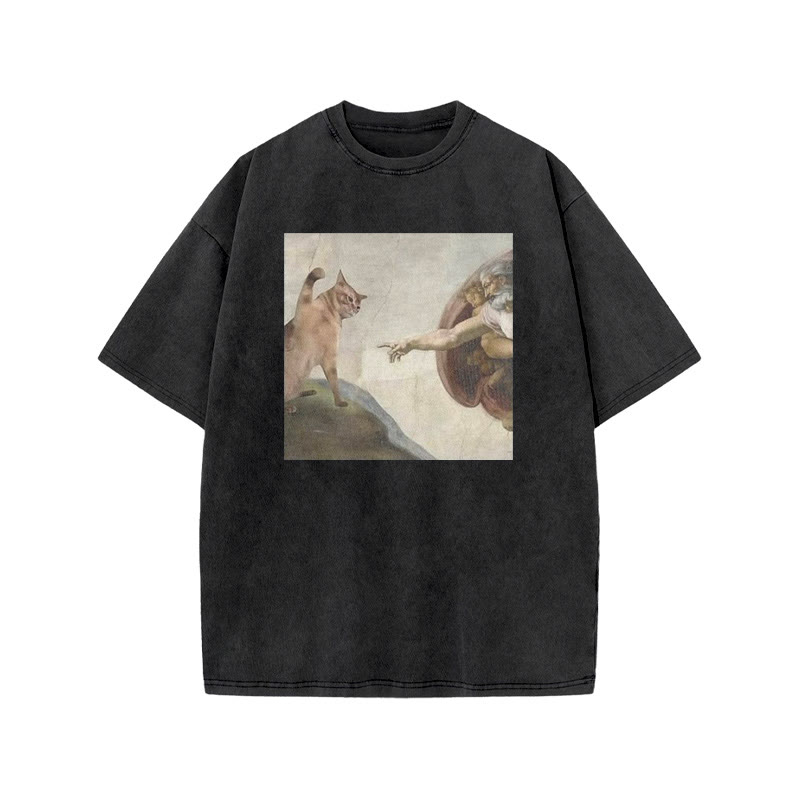 Unisex Oil Painting Cat Print Acid Washed T-shirt