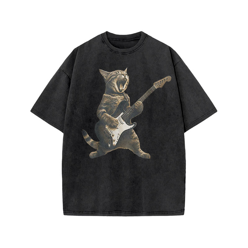 Unisex Rock Cat Playing Guitar Print Acid Washed T-shirt