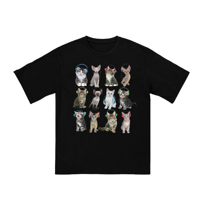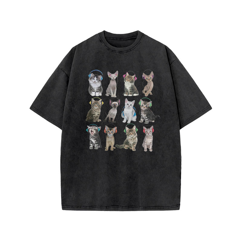 Unisex Cats Headphone Print Acid Washed T-shirt