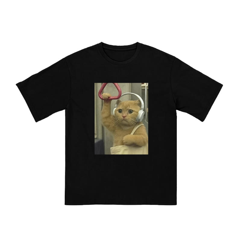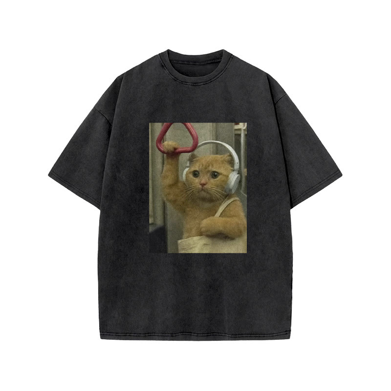 Unisex Cat Riding The Subway Print Acid Washed T-shirt