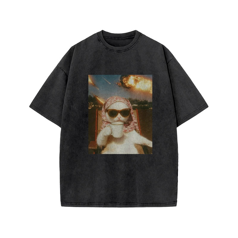 Unisex Cat With Cigarette In Mouth Print Acid Washed T-shirt