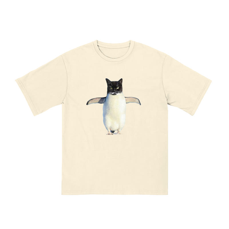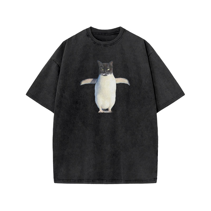 Unisex Cat Penguin Print Acid Washed T-shirt
