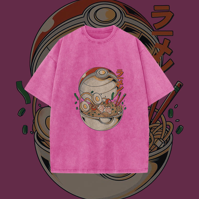 Unisex Japanese Fresh Ramen Bowl Print Acid Washed T-shirt