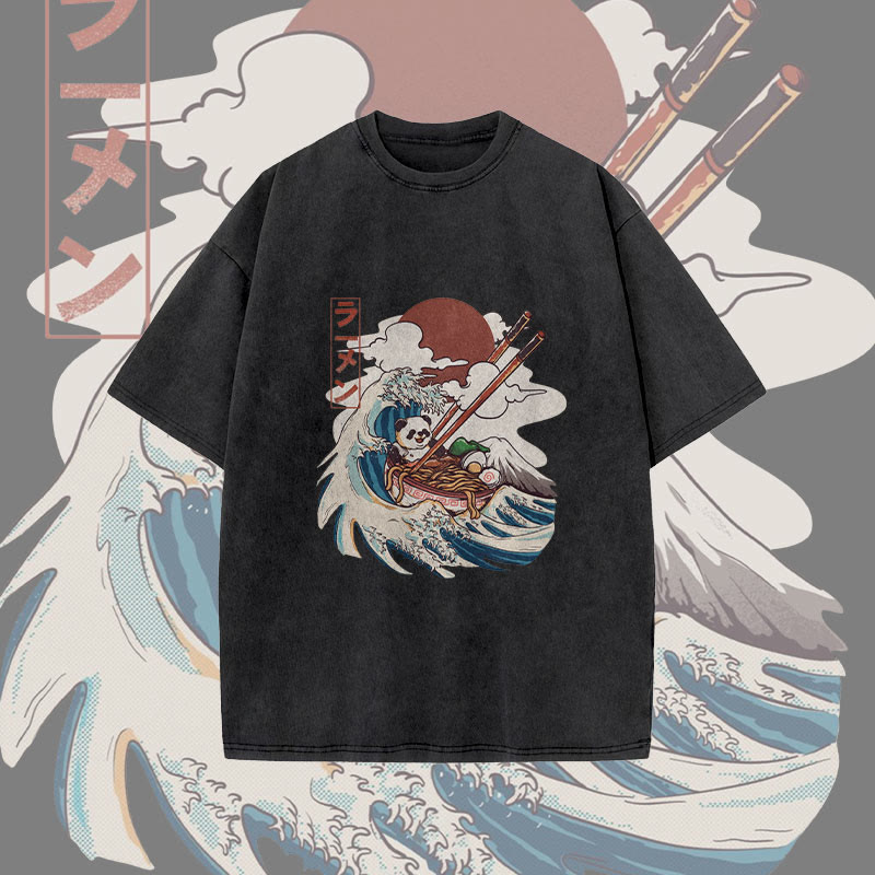 Unisex Japanese Panda Ramen Wave Print Acid Washed T-shirt