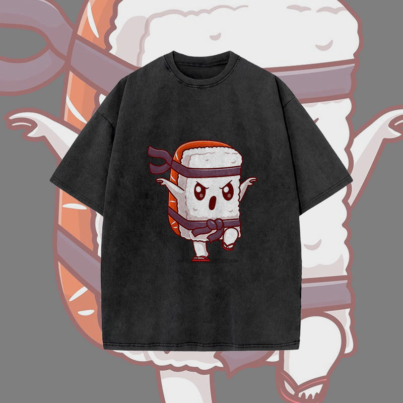 Unisex Japanese Ninja Sushi Roll Print Acid Washed T-shirt