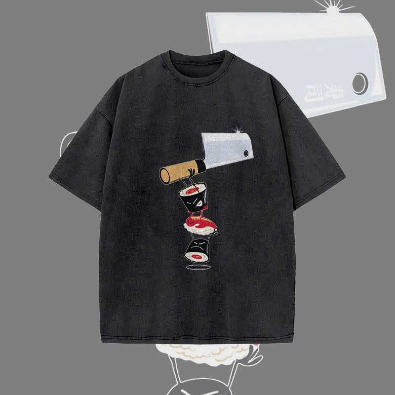 Unisex Chopping Sushi Roll Print Acid Washed T-shirt