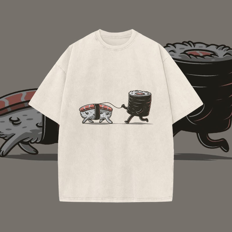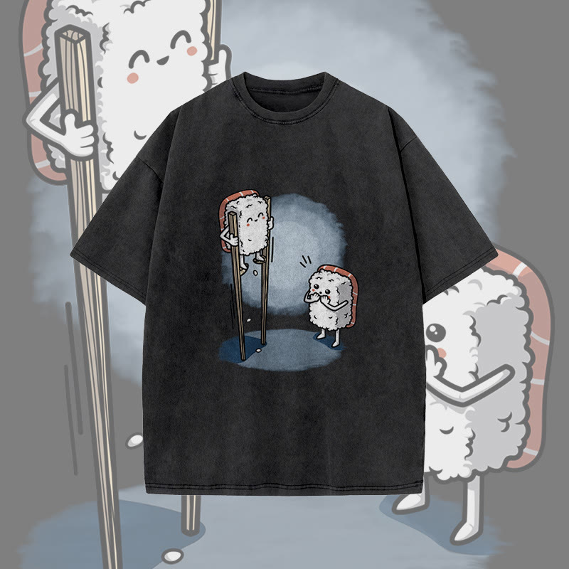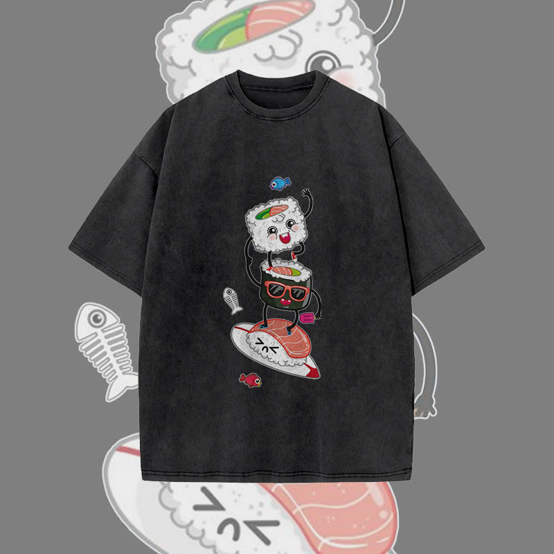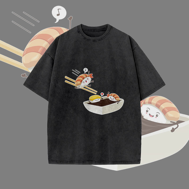 Unisex Japanese Adventurous Sushi Print Acid Washed T-shirt