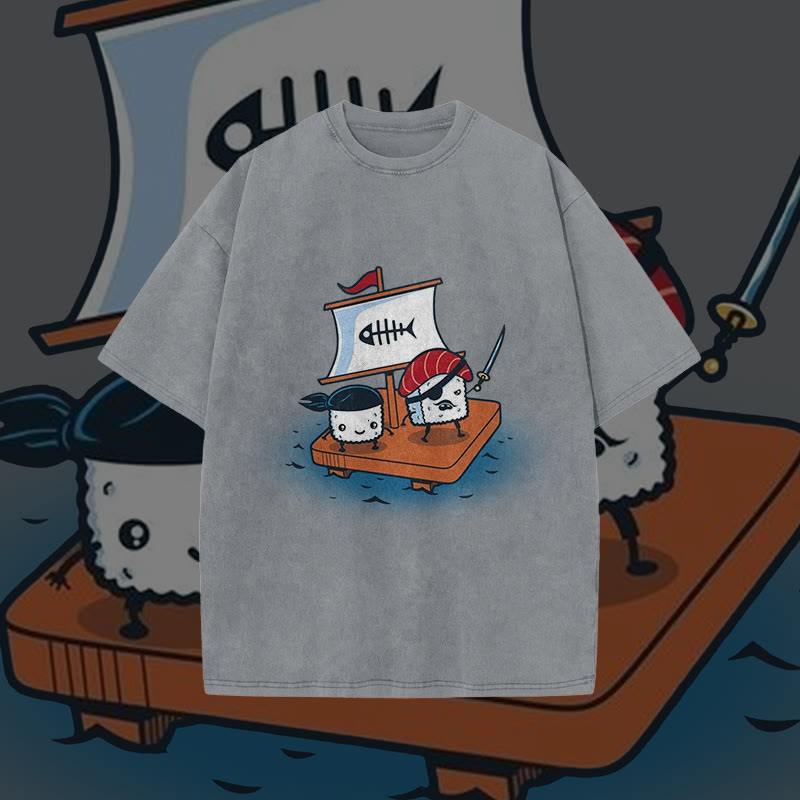Unisex Pirate Sushi Adventure Print Acid Washed T-shirt