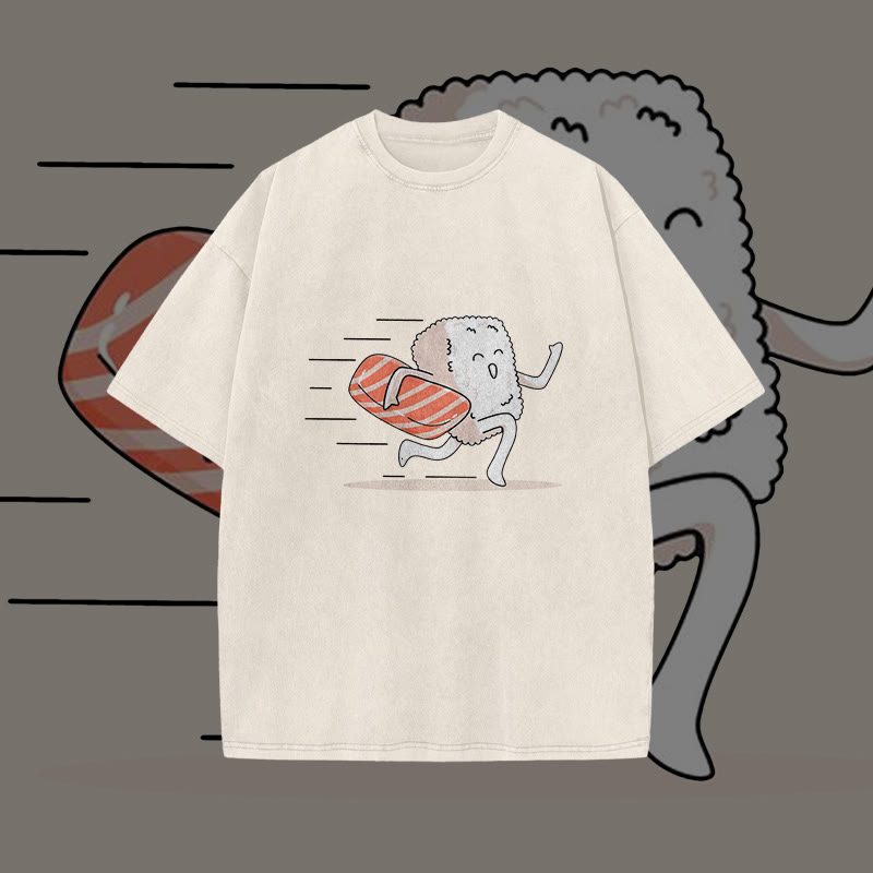 Unisex Creative Sprinting Sushi Print Acid Washed T-shirt