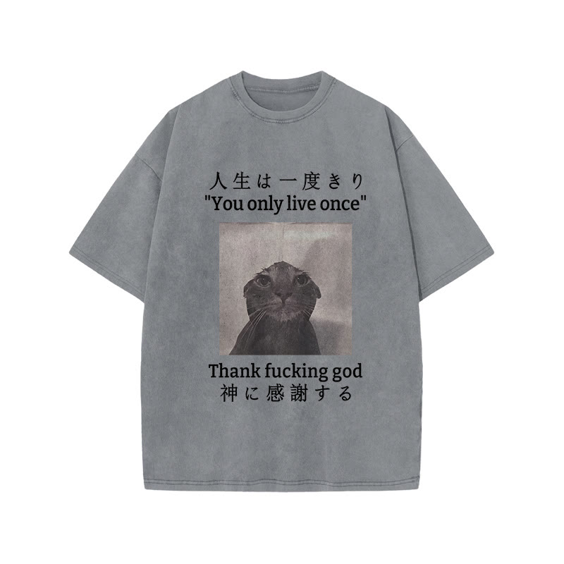 Unisex Funny Melancholy Cat Print Acid Washed T-shirt