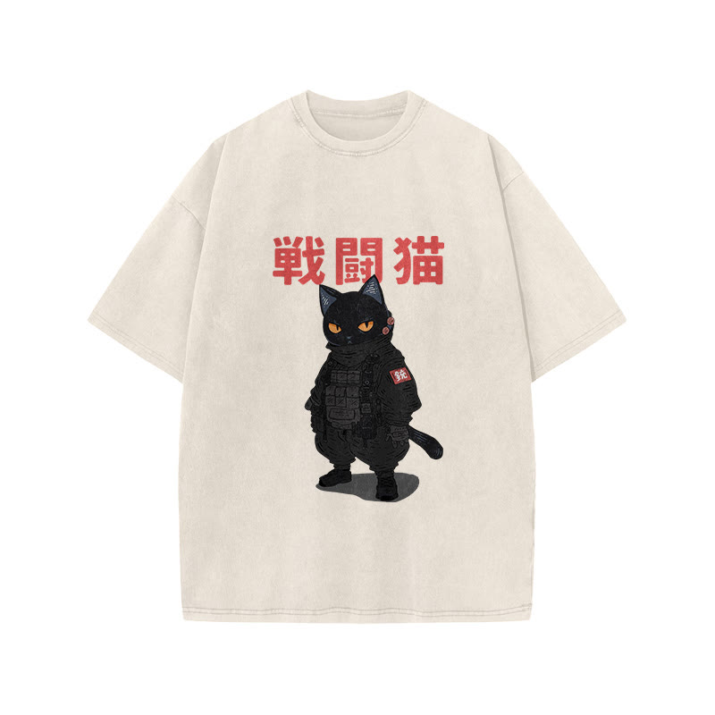 Unisex Ukiyoe Funny Cat Vintage Print Acid Washed T-shirt