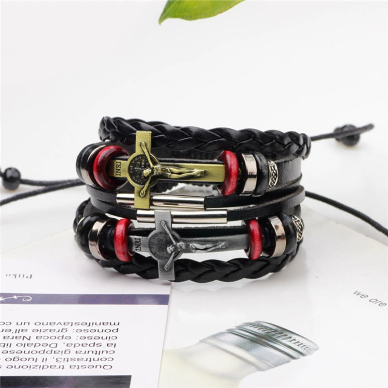 Cross Pendant Double Leather Braided Bracelet