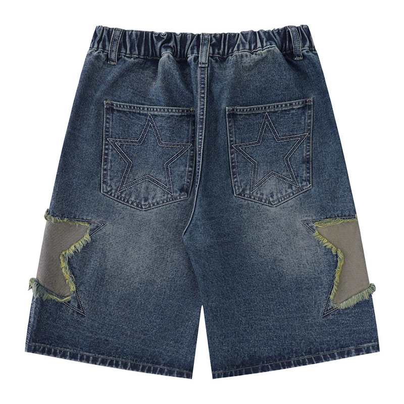 Loose Straight-leg Denim Shorts With Patchwork Star Embroidery