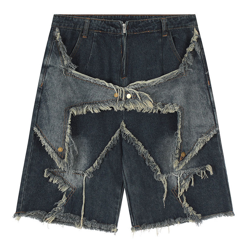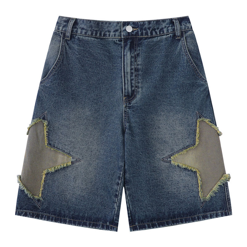 Personalized Raw Edge Five-pointed Star Patch Embroidered Straight Denim Shorts