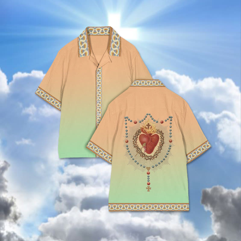 Ombre Contrasting Cross Heart Print Camp-collar Shirt