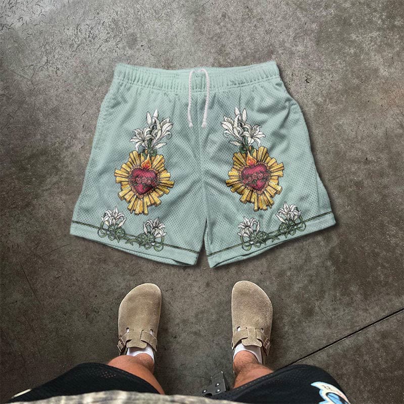 Thorn Floral Cross Print Mesh Casual Shorts