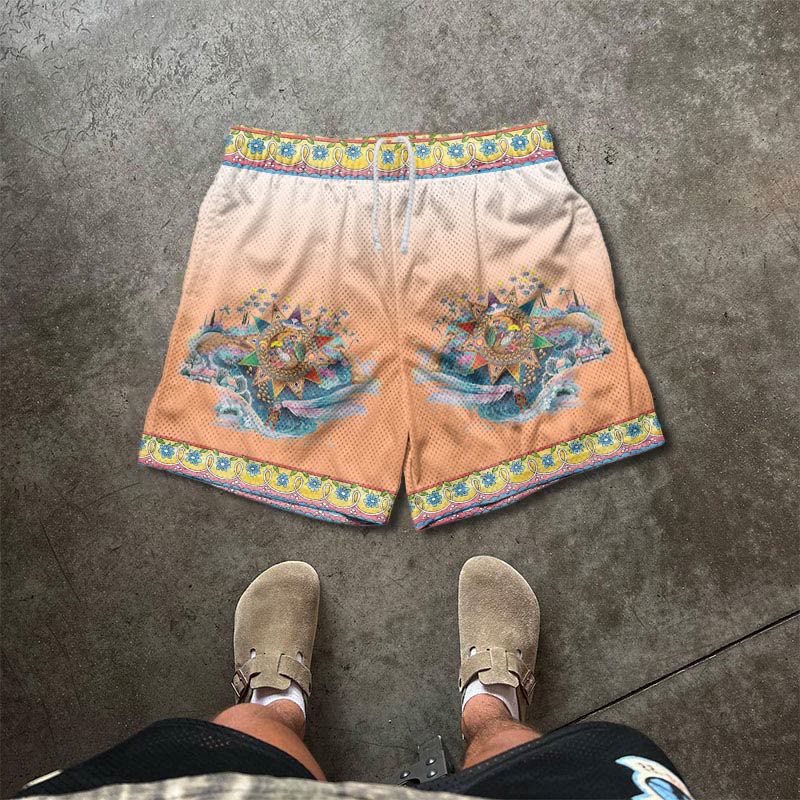 Round Diamond Rhombus Ethnic Print Mesh Casual Shorts