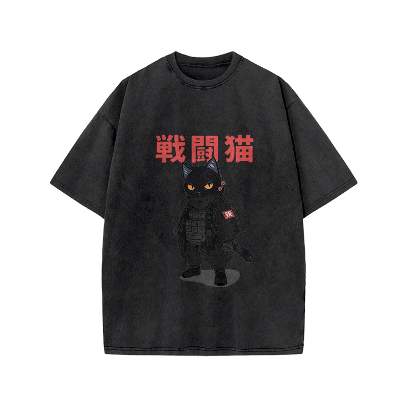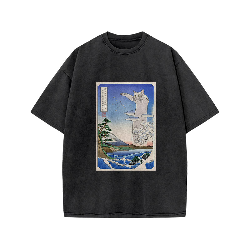 Unisex Ukiyoe Funny Cat Vintage Print Acid Washed T-shirt