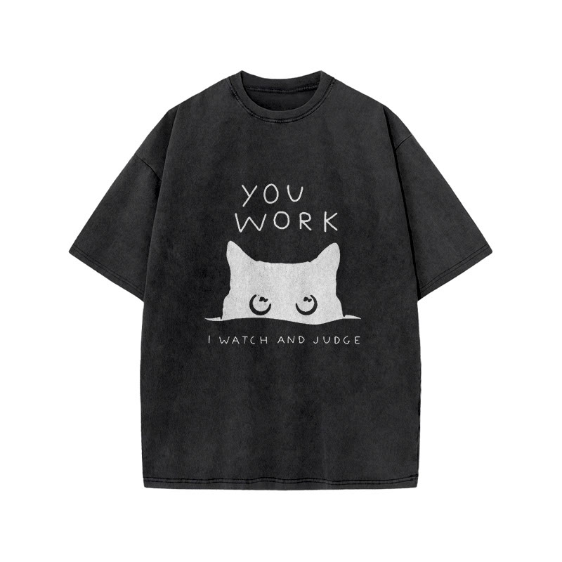 Unisex Cat Watching Your Work Vintage Print Acid Washed T-shirt