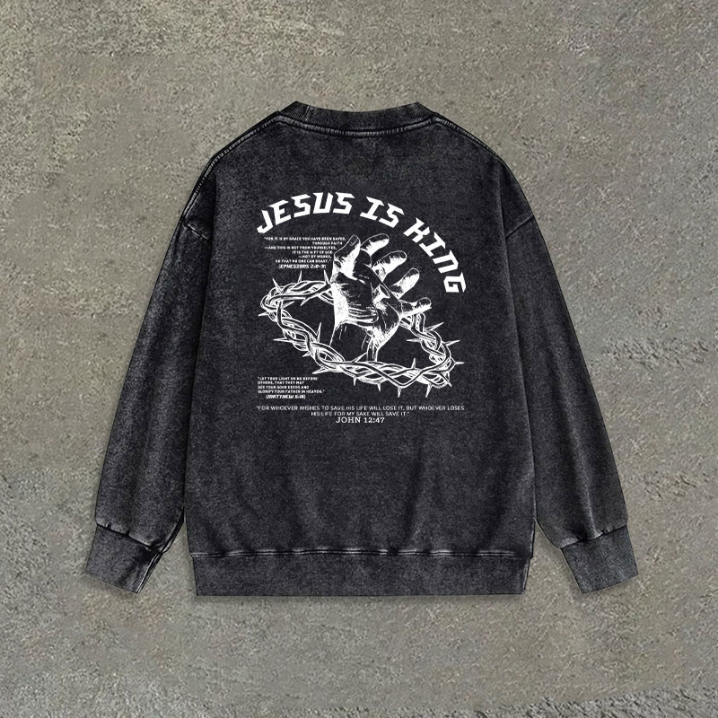 Jesus Is King Print Causal Acid Washed Sweatshirt