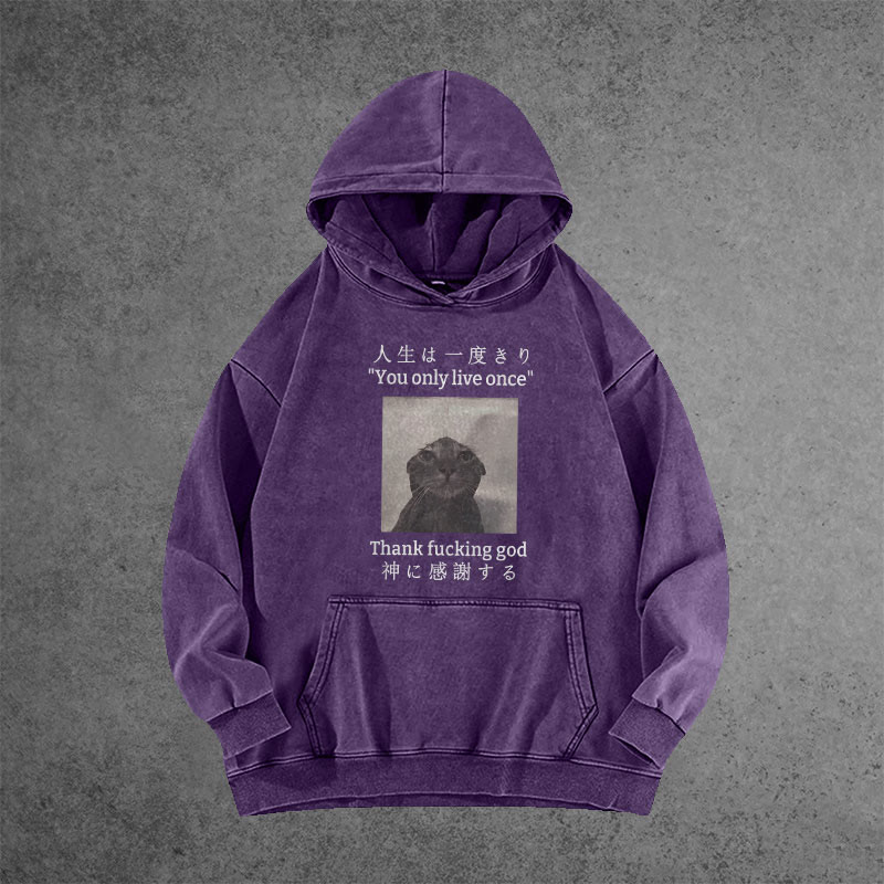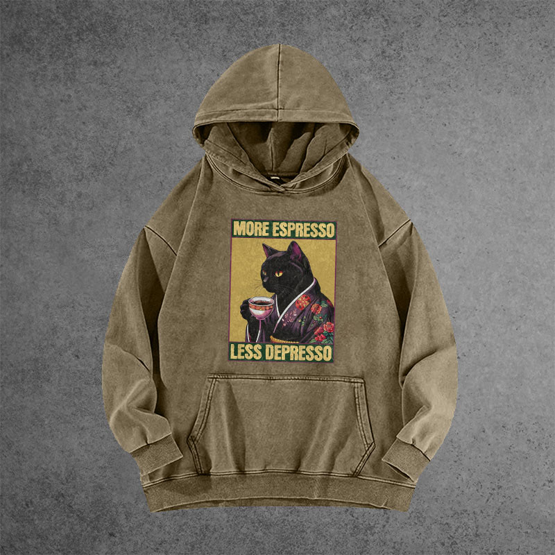 Unisex Funny Melancholy Cat Vintage Printed Washed Hoodie