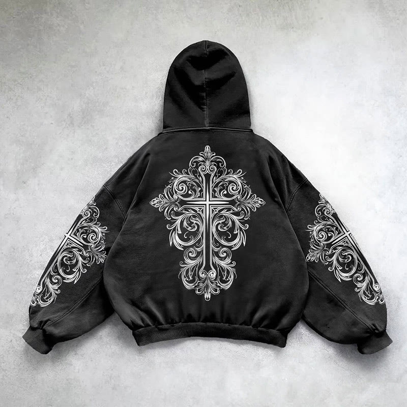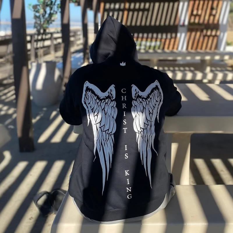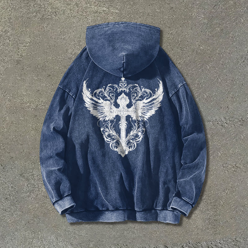 Divine Guardian Wings Cross Print Washed Hoodie
