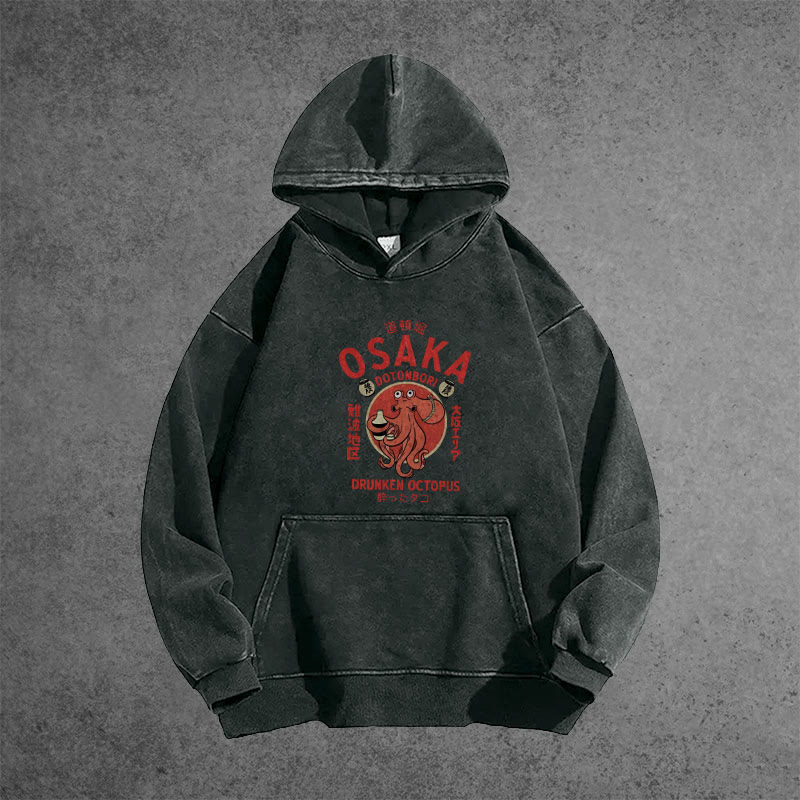Unisex Osaka Dotonbori Octopus Vintage Printed Washed Hoodie