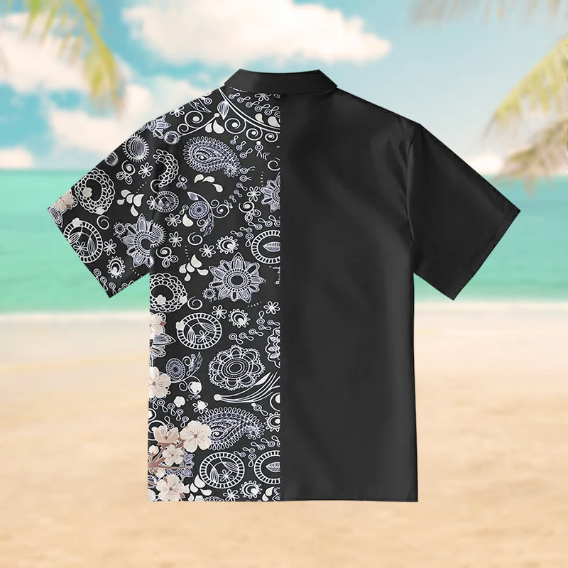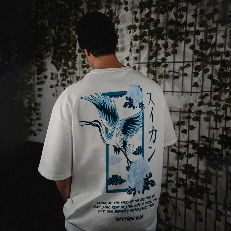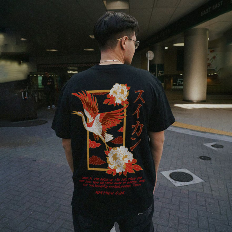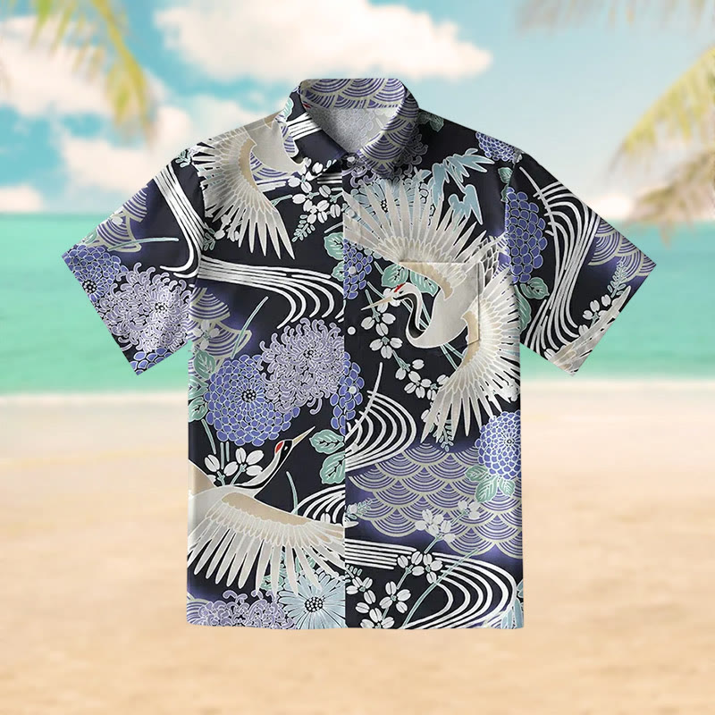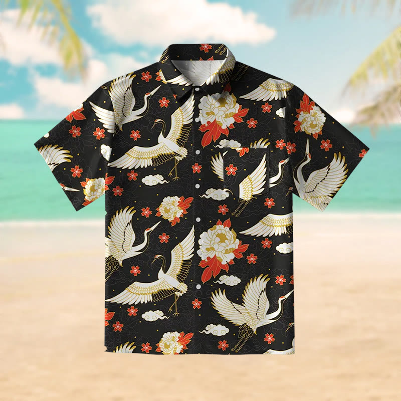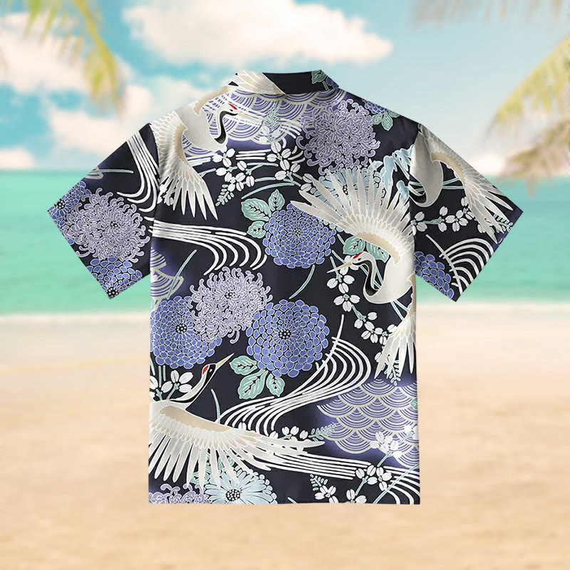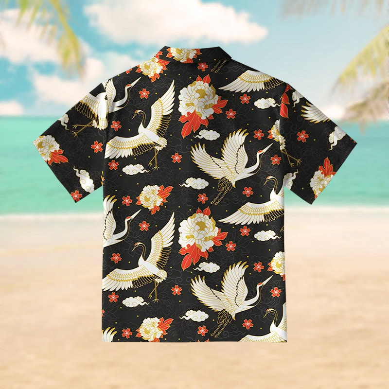 Celestial Cranes And Blossoms Print Short Sleeve Shirt