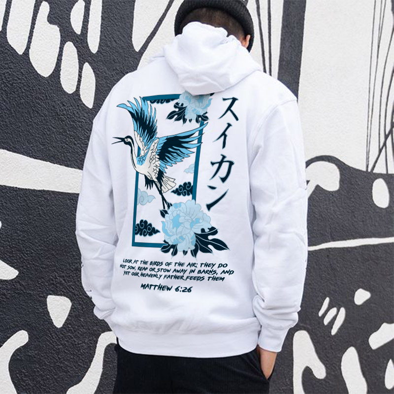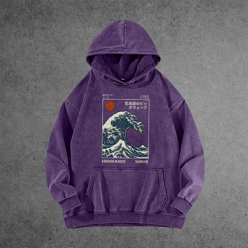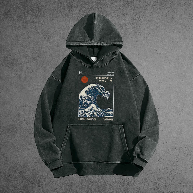 Unisex Hokkaido Wave Vintage Printed Washed Hoodie