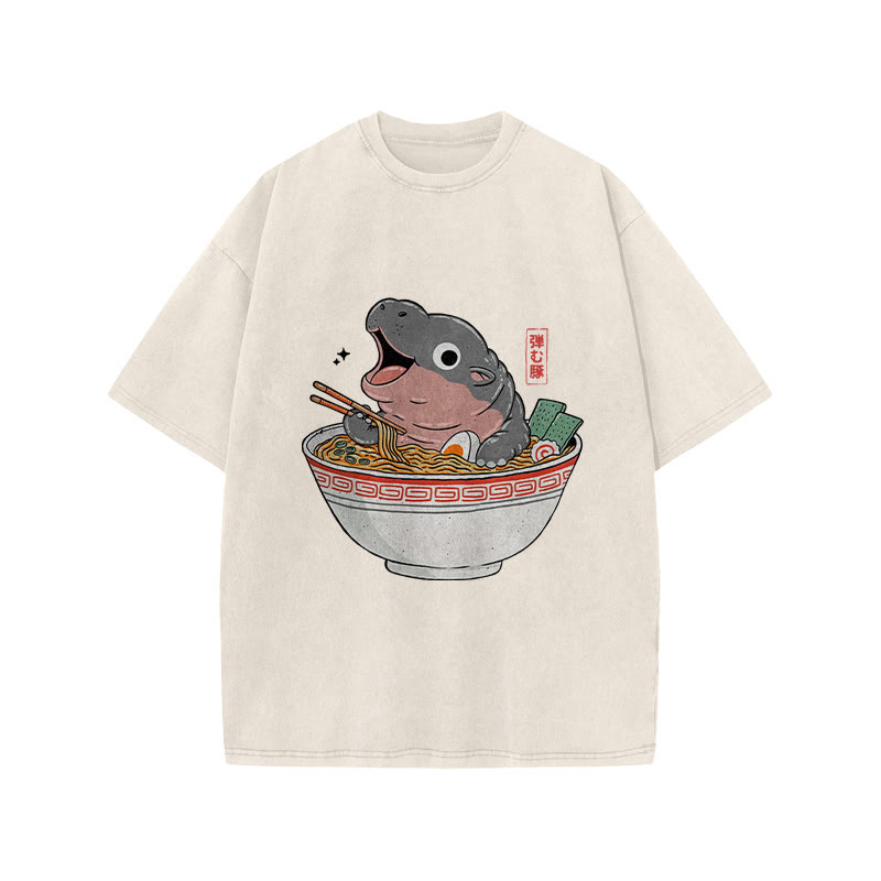 Unisex Internet Celebrity Little Hippo Print Acid Washed T-shirt