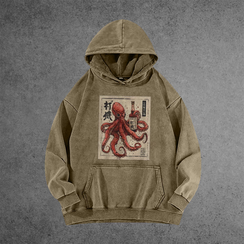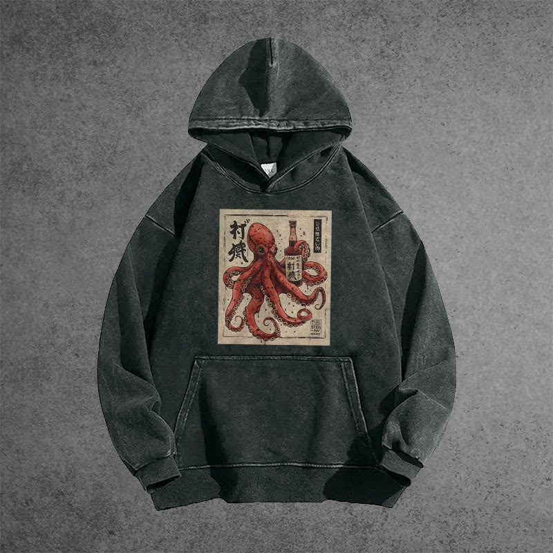 Unisex Osaka Saké Octopus Vintage Printed Washed Hoodie