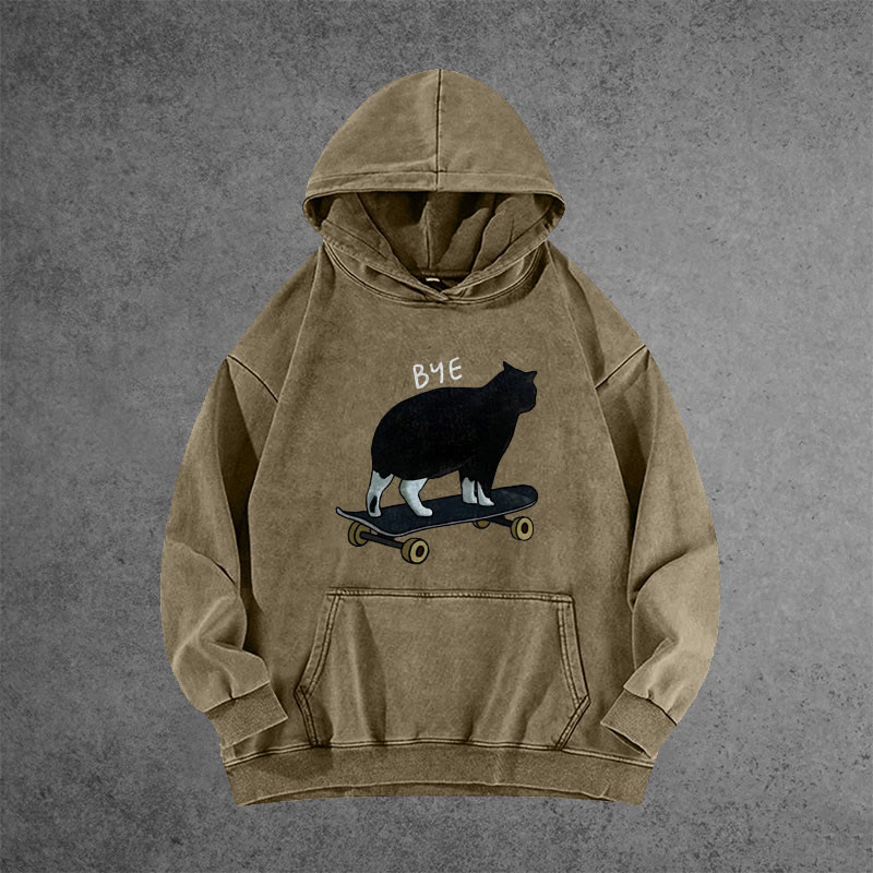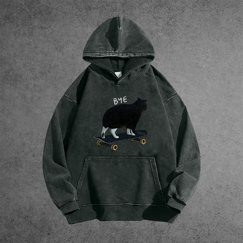 Unisex Cat On Skateboard Vintage Printed Washed Hoodie