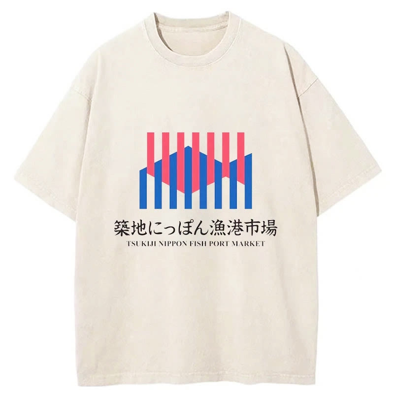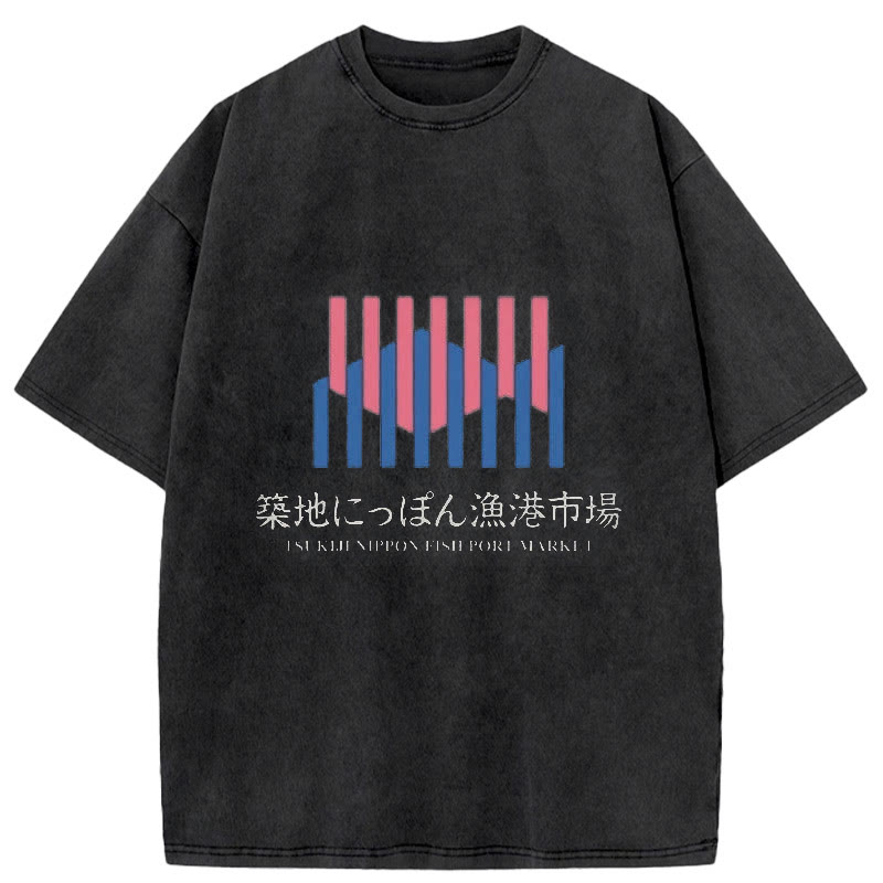 Unisex Print Tsukiji Nippon Fish Port Market Acid Washed T-shirt