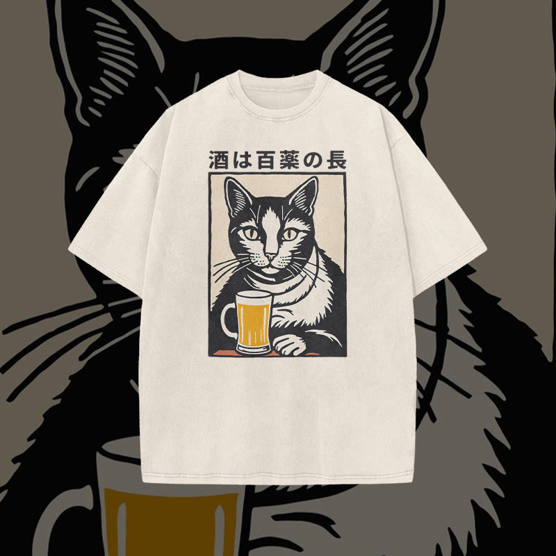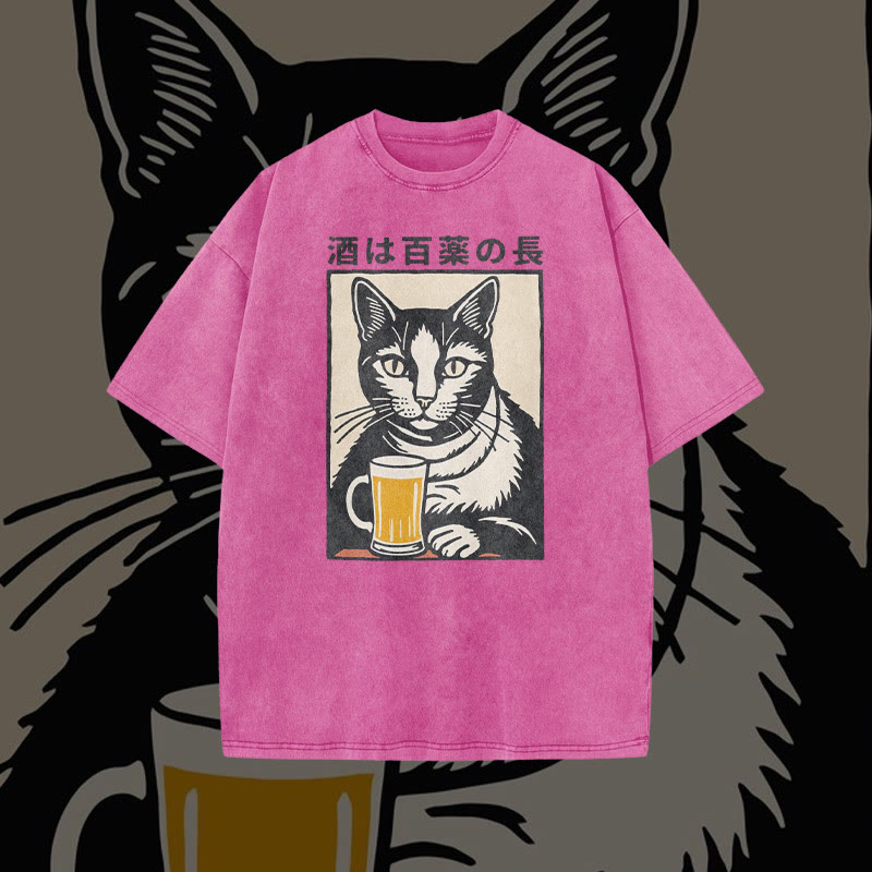 Unisex Japanese Beer Cat Print Acid Washed T-shirt