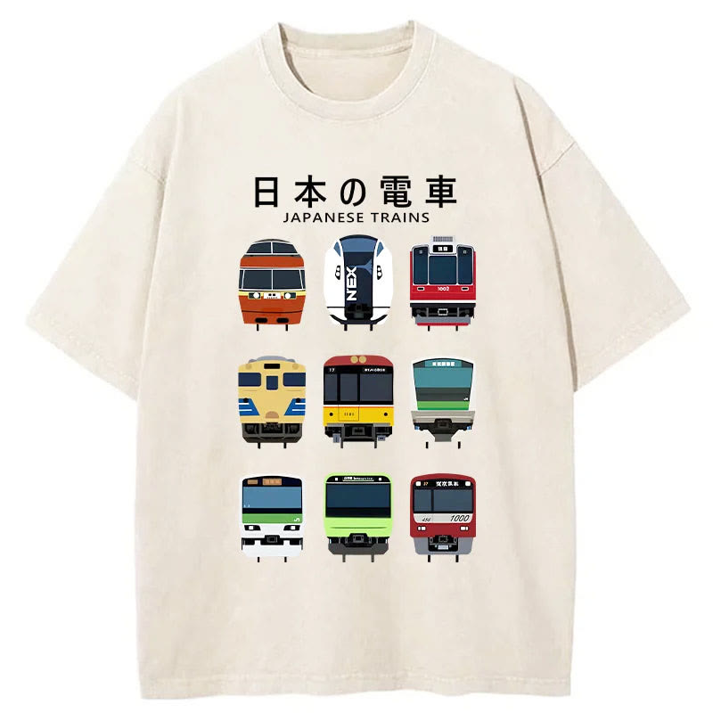 Unisex Japanese Train Collection Print Acid Washed T-shirt