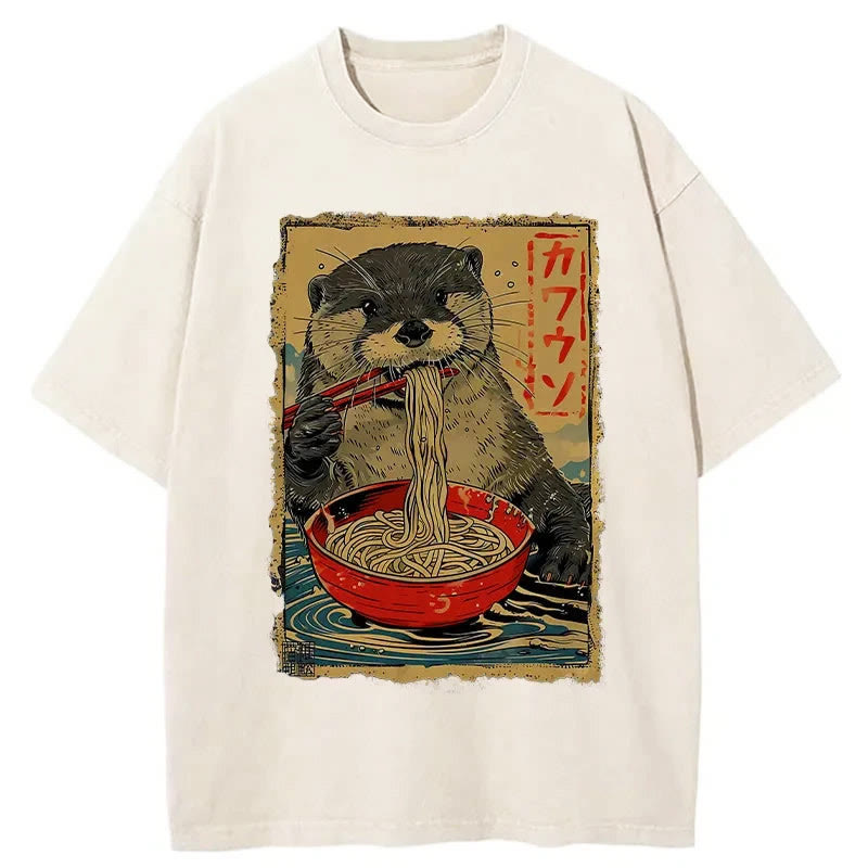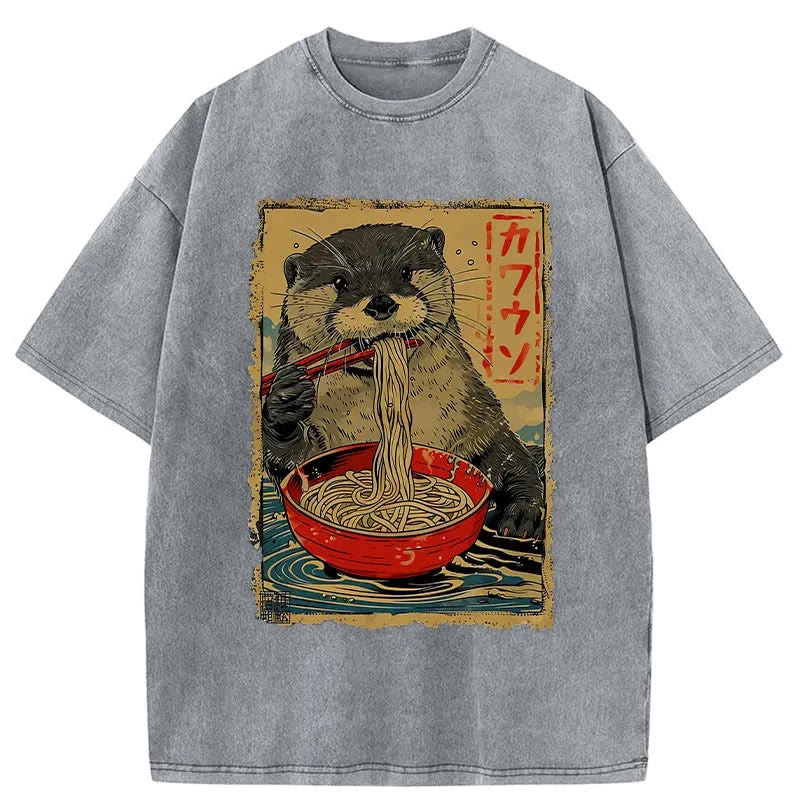 Unisex Otter Eating Ramen Japan Print Acid Washed T-shirt