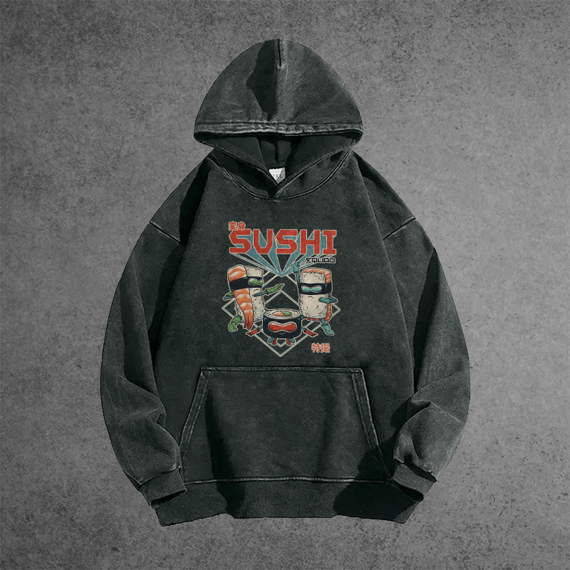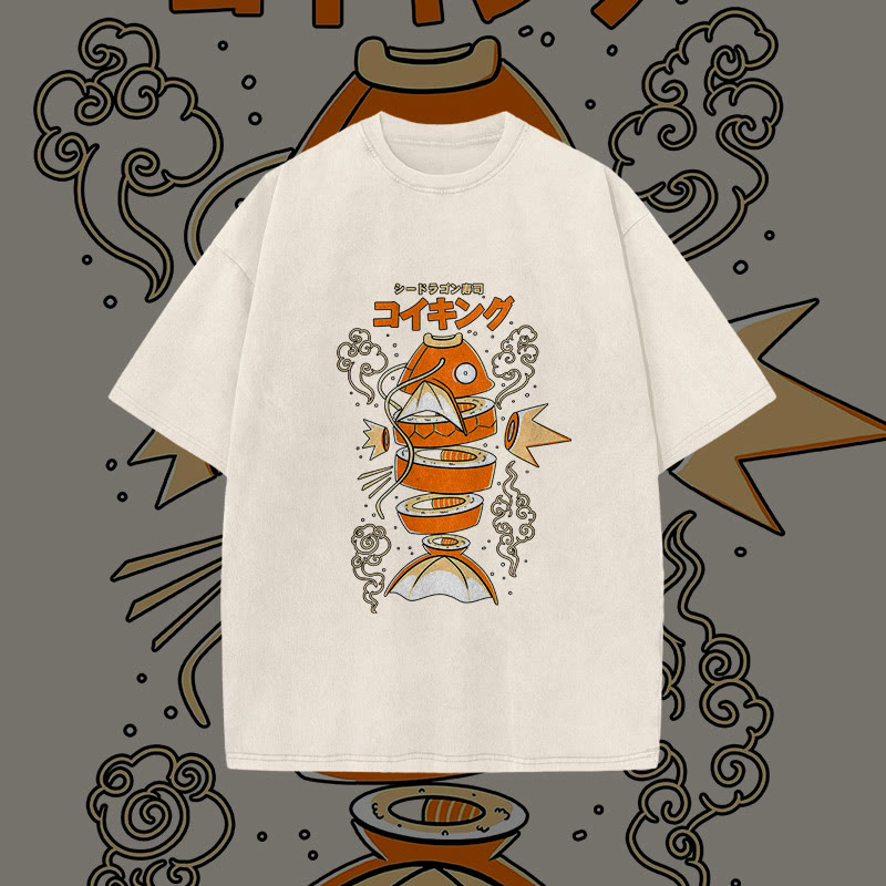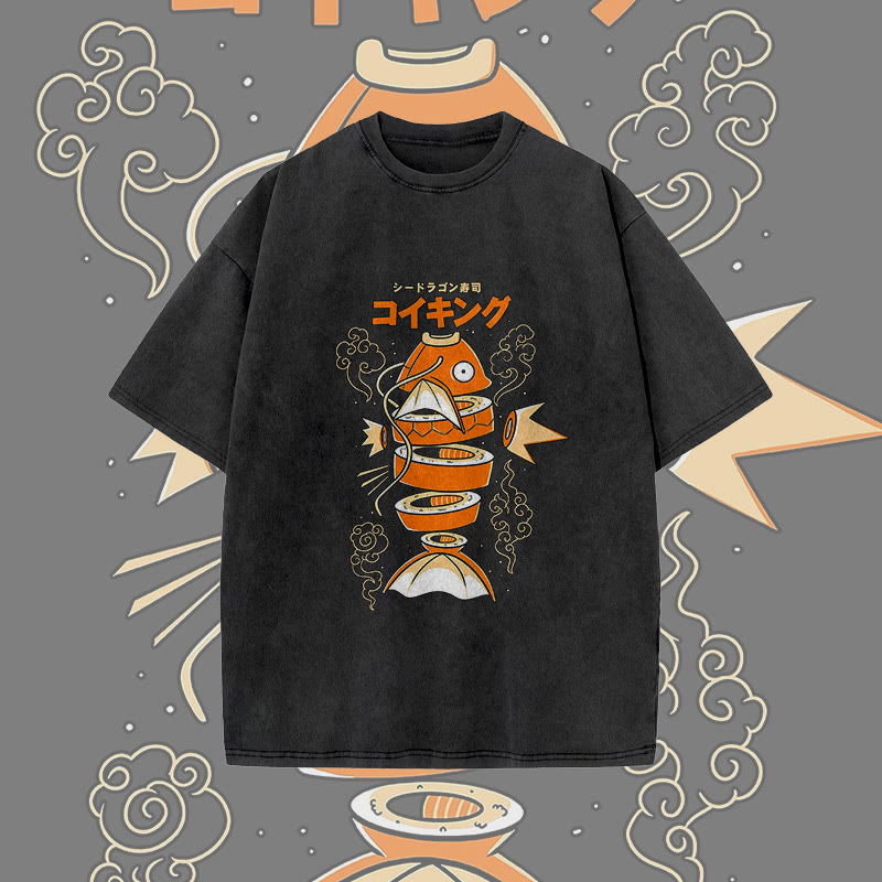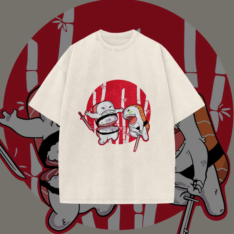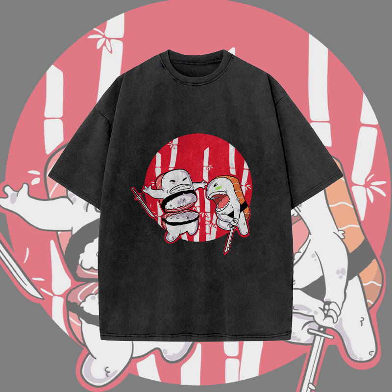 Unisex Japanese Fighting Sushi Print Acid Washed T-shirt