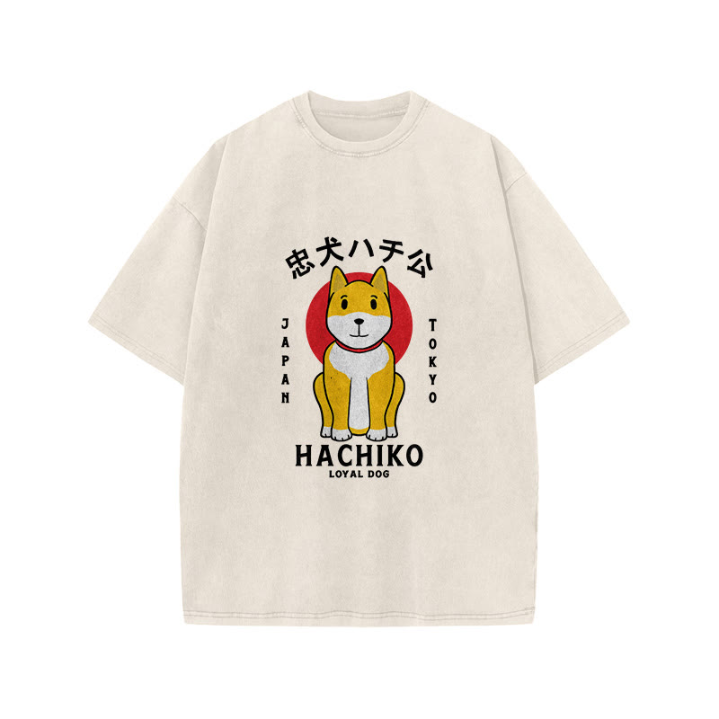 Unisex Japanese Hachiko Loyal Dog Print Acid Washed T-shirt