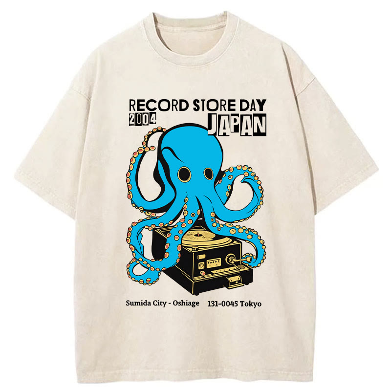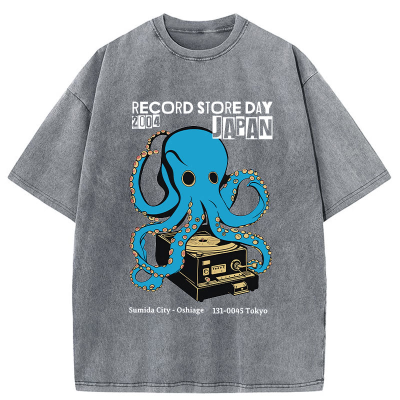 Unisex Japanese Octopus Records Print Acid Washed T-shirt