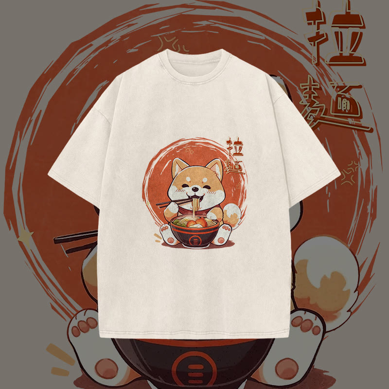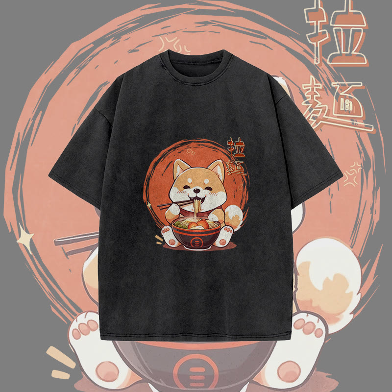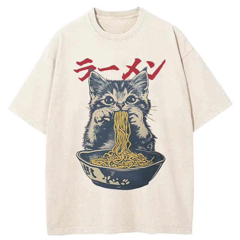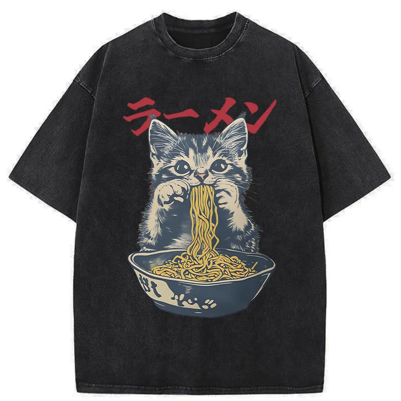 Unisex Japanese Cat Eating Ramen Print Acid Washed T-shirt