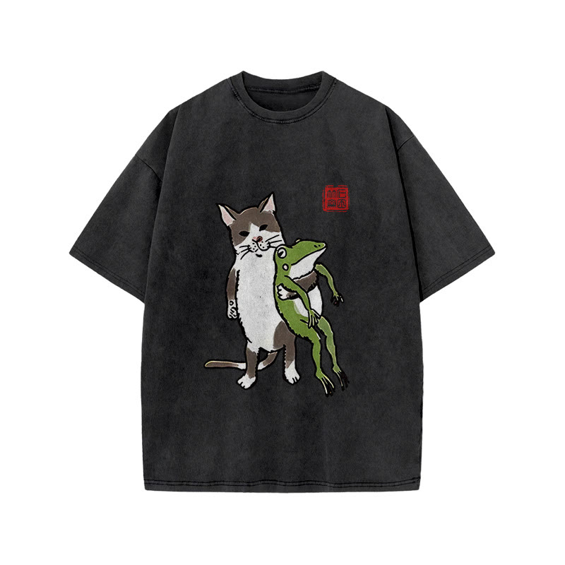Unisex Cat Holding A Frog Print Acid Washed T-shirt
